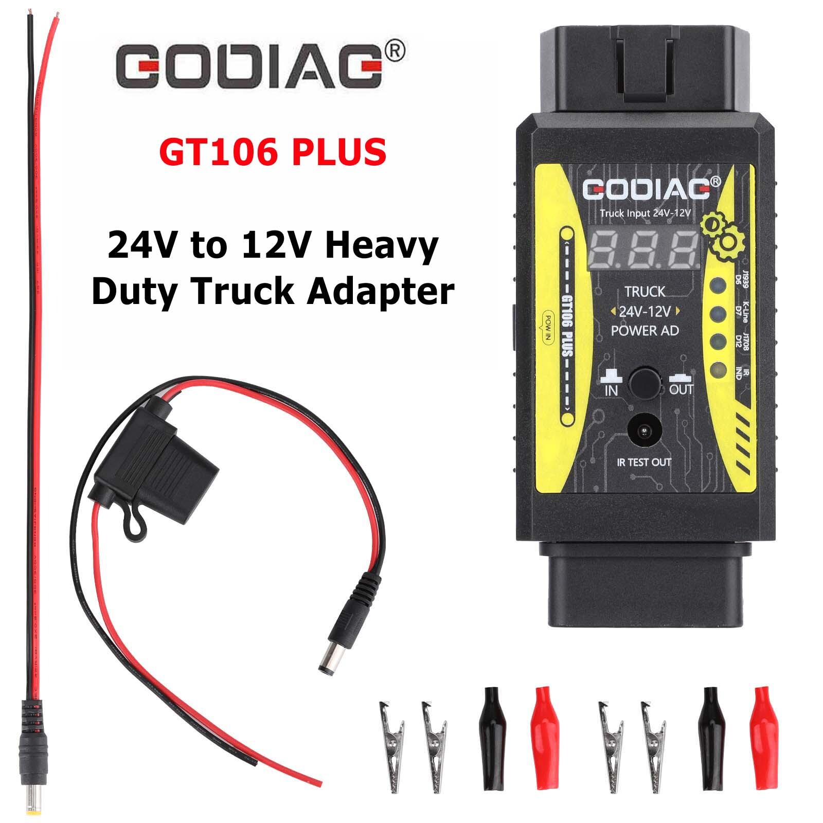 GODIAG GT106 Plus 24V to 12V Heavy Duty Truck Converter GODIAG GT106 Heavy Duty Truck Adapter Newly Added Fuel Injector Cleaning & Testing Relay Testing for Cars & Trucks