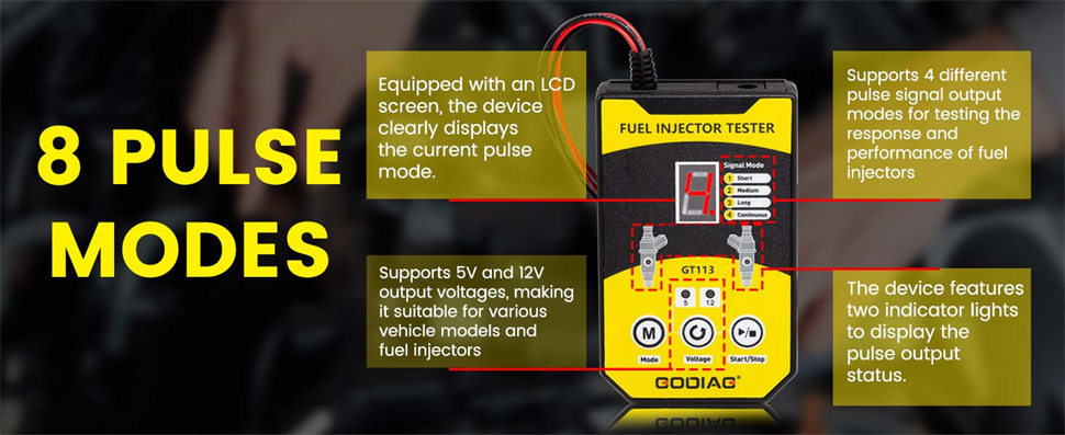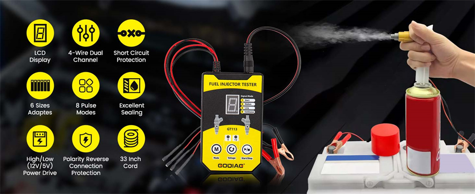 GODIAG GT113 universal fuel injector tester offers users 6 sizes of adapters amd 8 pulse modes for them to test almost all kinds of fuel injectors.