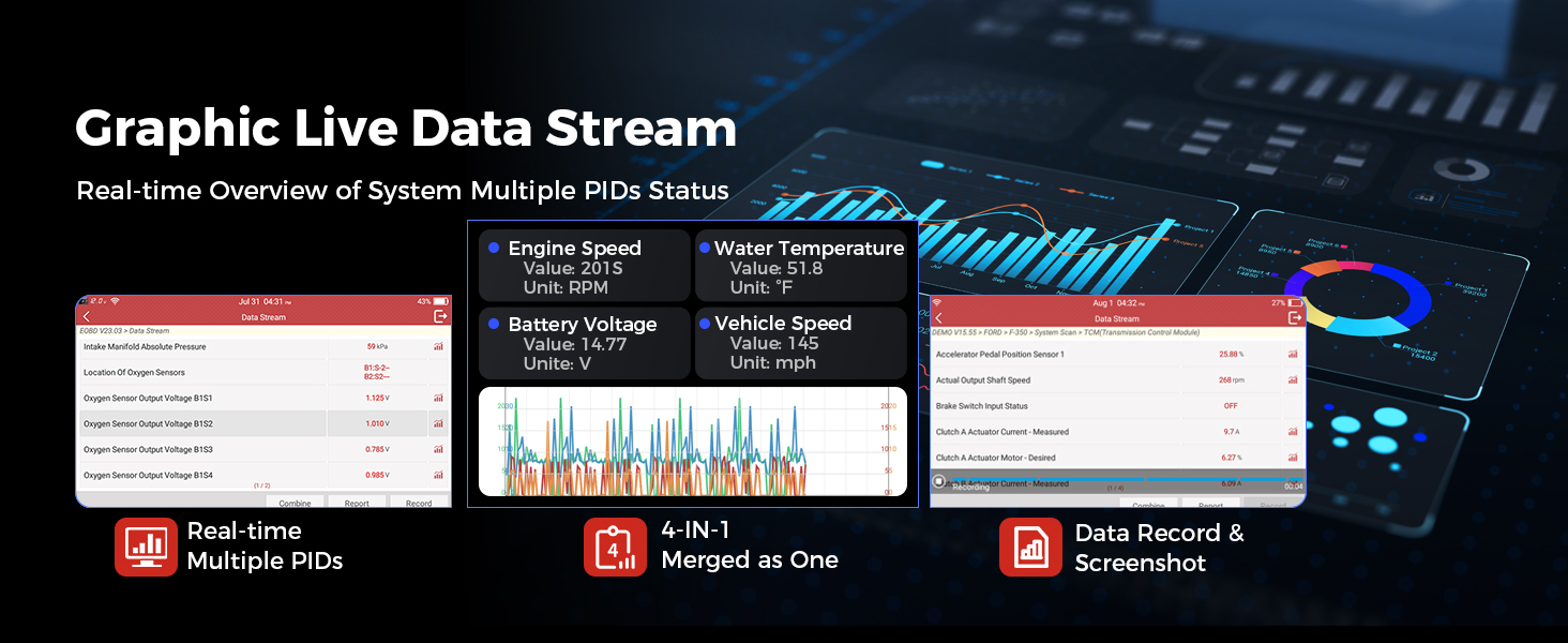 This LAUNCH scanner can display “multi-PID” live data stream in graphics, 4 PIDS merged into one screen, allowing you to easily examine various sensors, actuators and calculated values, at a glance. And you can record and playback a readout or graph. This is useful if you have an intermittent problem that doesn’t generate a code. The option also comes with ways to screenshot and share.