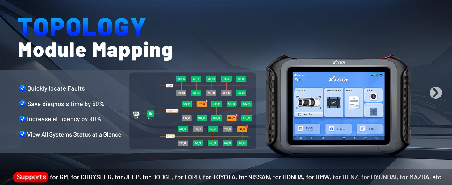 XTOOL D9 MAX bidirectional scan tool with intuitive topology mapping. Harnesses intuitive topology mapping for comprehensive visualization of the vehicle all system. It shows all available control units in different colors, the numbers of system, the scanned system, and the scan results, bringing maximum convenience & superfast speed for you to do swift diagnosis & high-level repairs.