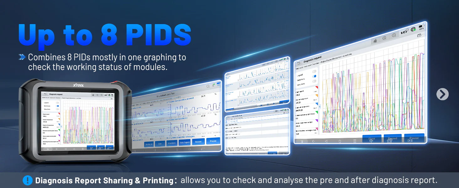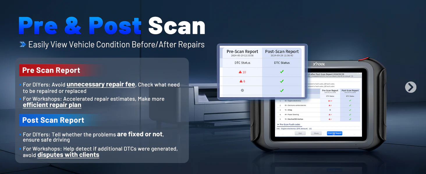 The enhanced Pre/Post Scan feature captures baseline data before repairs and validates results after service completion, ensuring transparency and accuracy in maintenance workflows. Diagnostic Report V2.0 offers customizable shop-branded reports, complete with freeze-frame images, parameter graphs, and technician notes—ideal for customer presentations and record keeping.