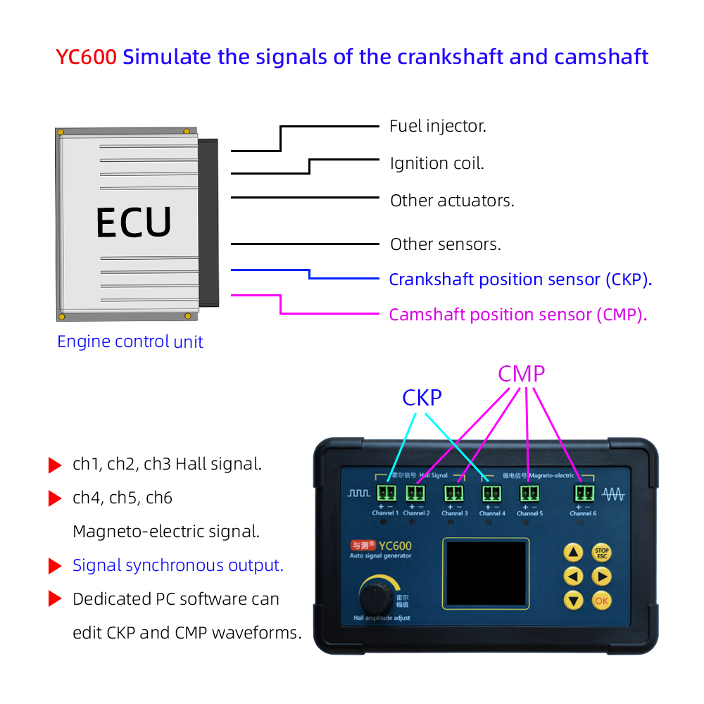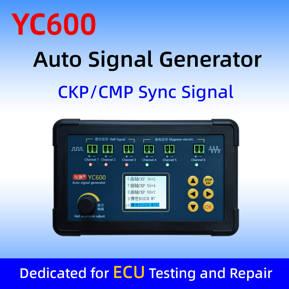 YC600 AUTO Signal Generator is Portable Auto Vehicle Signal Generator Simulate crankshaft and camshaft sensor signals. YC600 Crank And Cam Signal Generator Signal Frequency 1-8000HZ Support six channels signal synchronous output with PC software Support waveform editing. CheShiTech.com YC600 ckp cmp signal generator YC600 Crankshaft and camshaft signal generator used for testing gasoline, diesel, natural gas ECU.