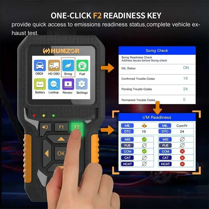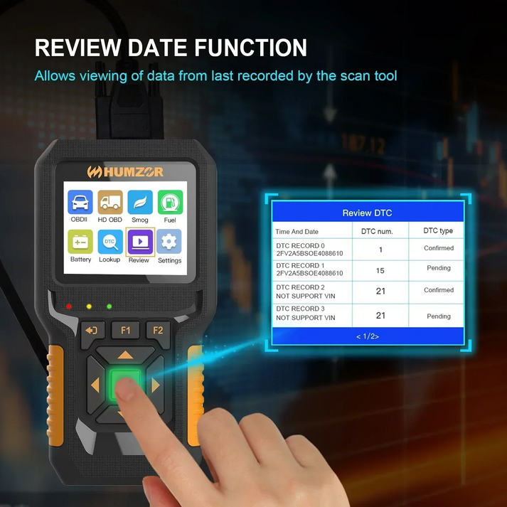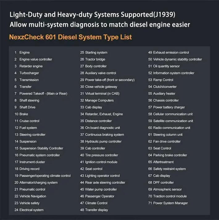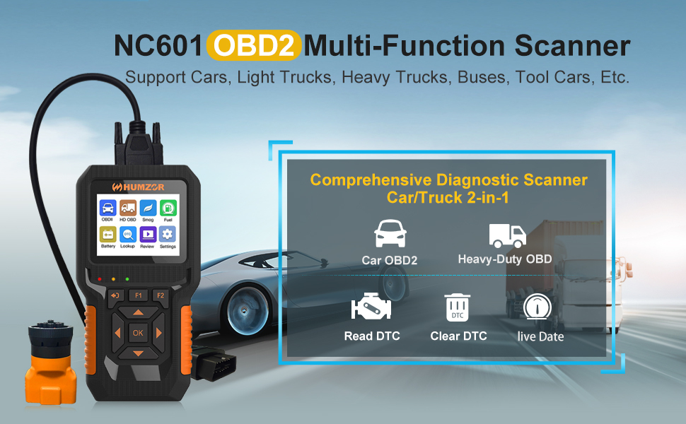 HUMZOR NC601 handheld scanner has a complete obd2 scanning diagnostic function, which can easily read car engine faults, and at the same time support a few heavy truck (diesel engine) code reading diagnostics (support J1939 protocol). You don’t need to buy different scanners, just use NC601 2 in 1 obd2 scan tool.
