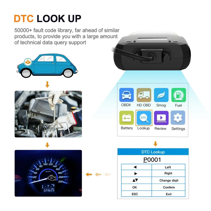 The device features an extensive fault code library. To look up a DTC: