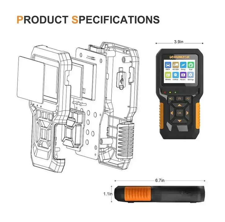New generation of HUMZOR NC601 code reader for diesel and gasoline cars. Support 12V and 24V gasoline and diesel OBD2 diagnosis prototcols. More than 50000 fault code analysis for car and heavy-duty. 12 functions supported: smog check fuel analysis battery analysis,live data freeze data mode 6 and mode 8 in the cars.