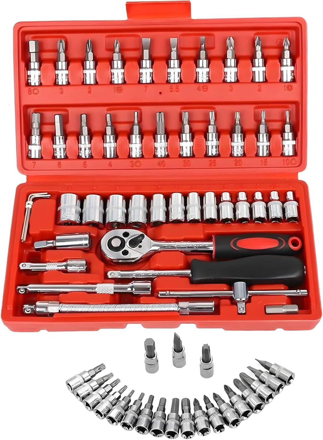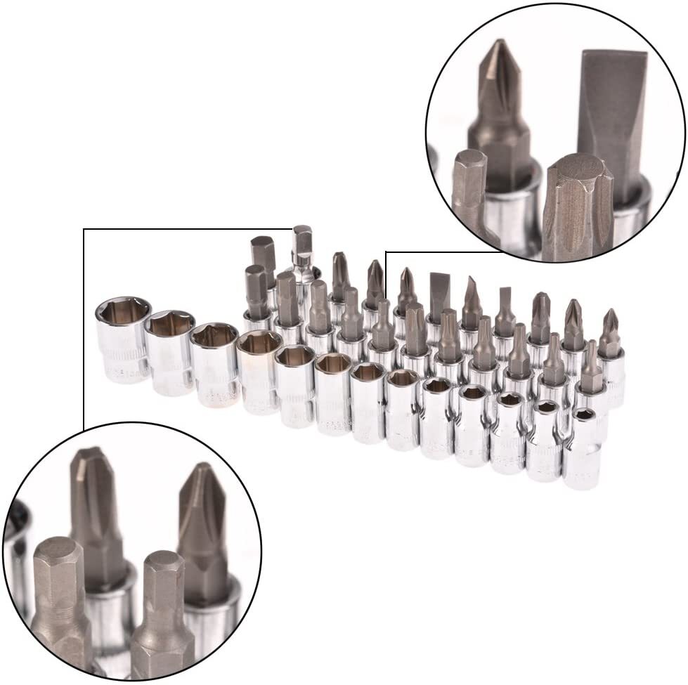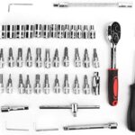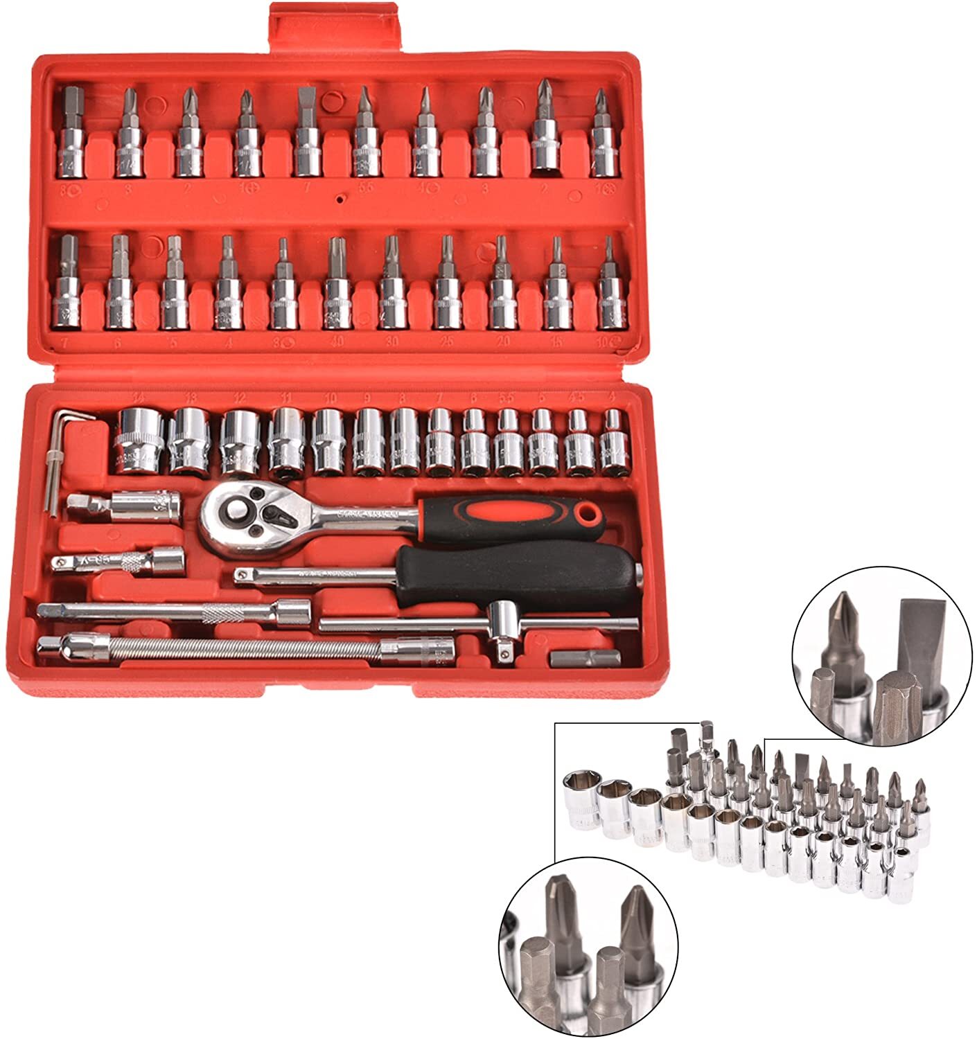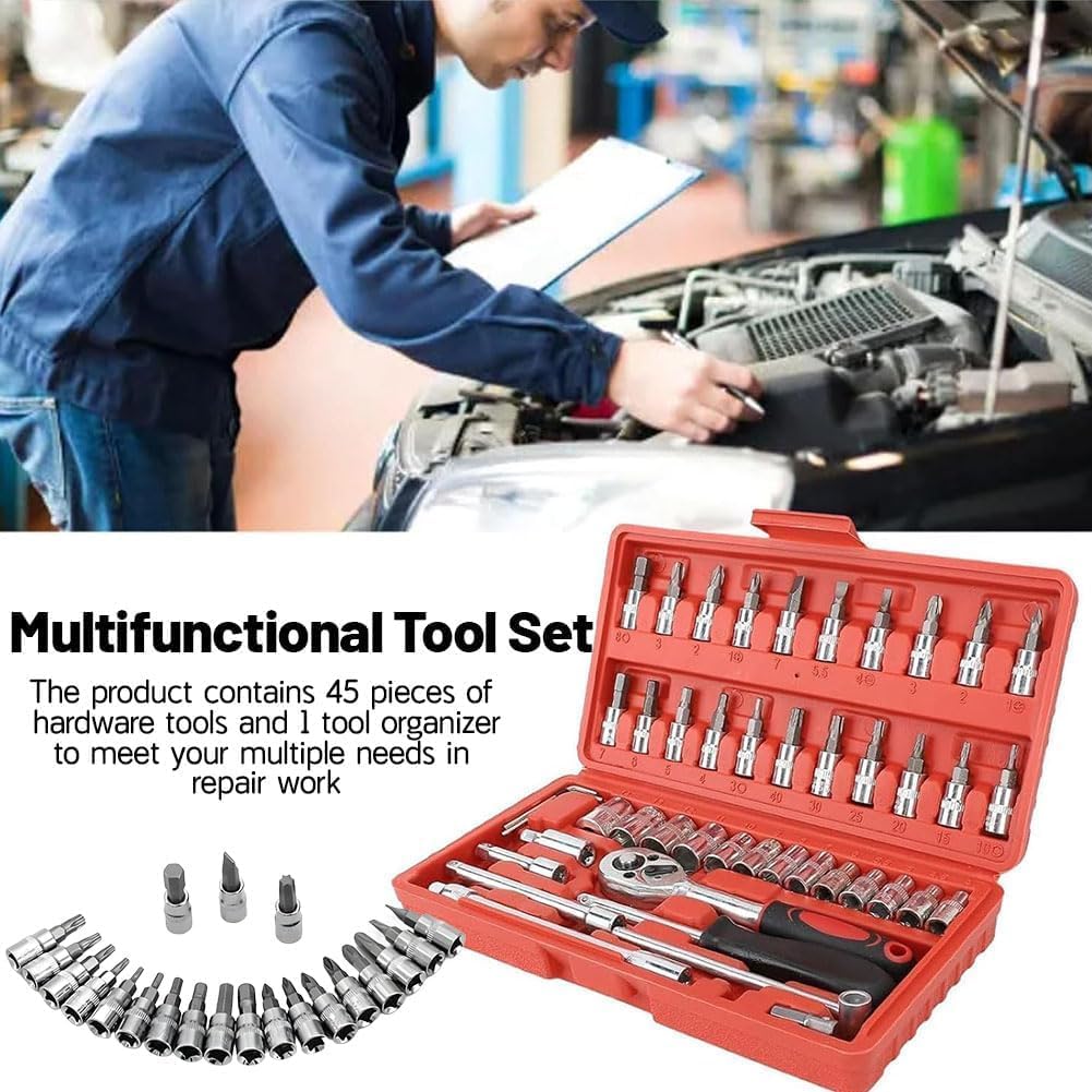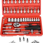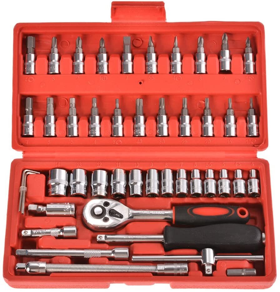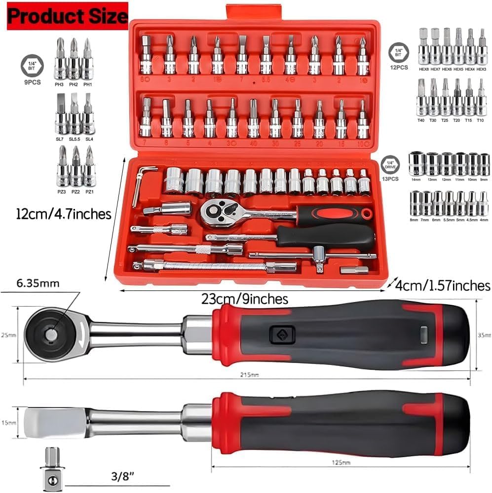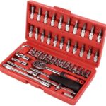 46pcs Socket Wrench Set is Carbon Steel Ratchet Wrench Set with 46 pieces. 1/4″ Drive Ratchet Metric Garage Car Repair Tools Kit 1/4 Ratchet Bit Hex Key Wrenches Spinner Handle Set With Ratchet Torque Wrench for Automobile, Bicycle, Mechanical. CheShiTech.com Drive Socket Wrench Set 46 In 1 Reversible Combination Ratchet Wrench Screwdriver with Case, Screw Driver Extension Socket Adapter.