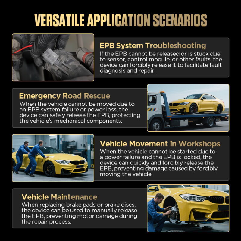 Vehicle Movement in Dealerships/Workshops: When the EPB is locked due to a power or circuit failure, the EPB release tool can quickly release the brake, effectively preventing vehicle damage caused by forced movement.