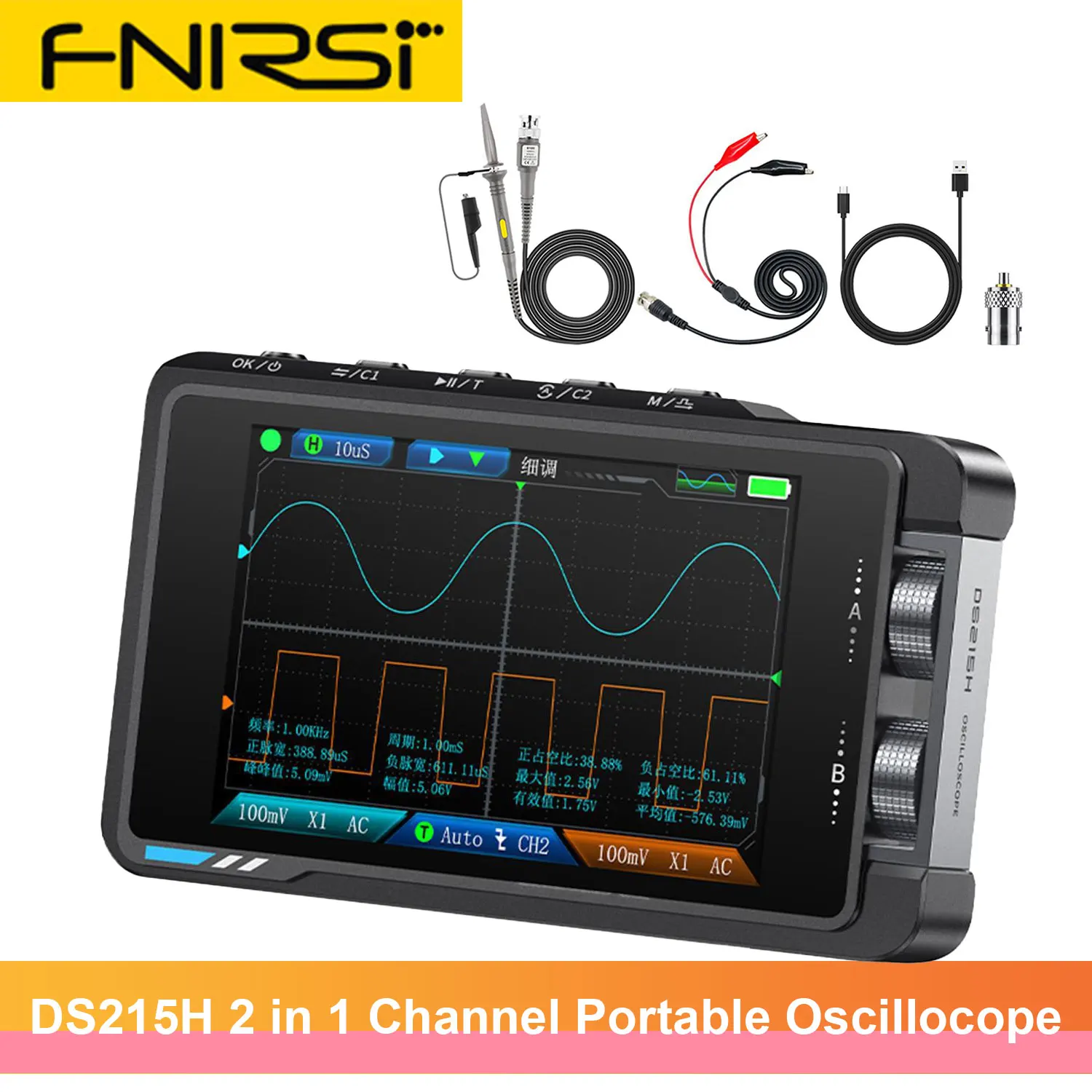 FNIRSI DS215H 2 in 1 Mini Oscilloscope Dual Channel DDS Signal Generator Key Features: