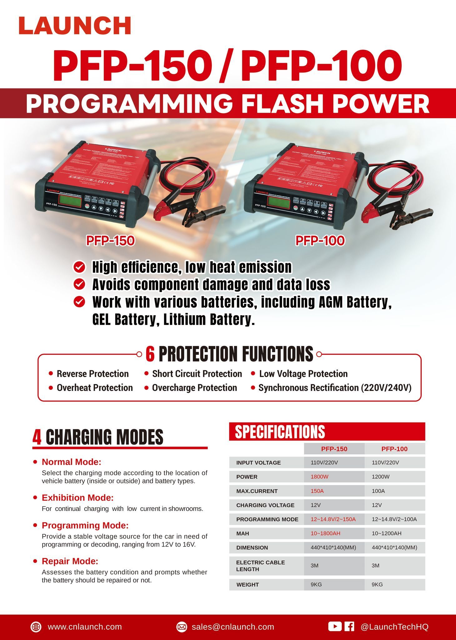 LAUNCH PFP-100 Programming FLASH POWER can prevent failure and abnormal during the process of prog.ramming due to low voltage. LAUNCH PFP100 Battery Charger 220V With 3M Cable for All Types of Vehicles, Cars, Trucks, Boats, Tractors, Buses. CheShiTech.com Original Launch PFP 100 Charger LAUNCH PFP-100 PFP100 Programming Flash Power Advanced Diagnostic Battery Charger And Maintainer has battery protection with automatic stop and alarm.