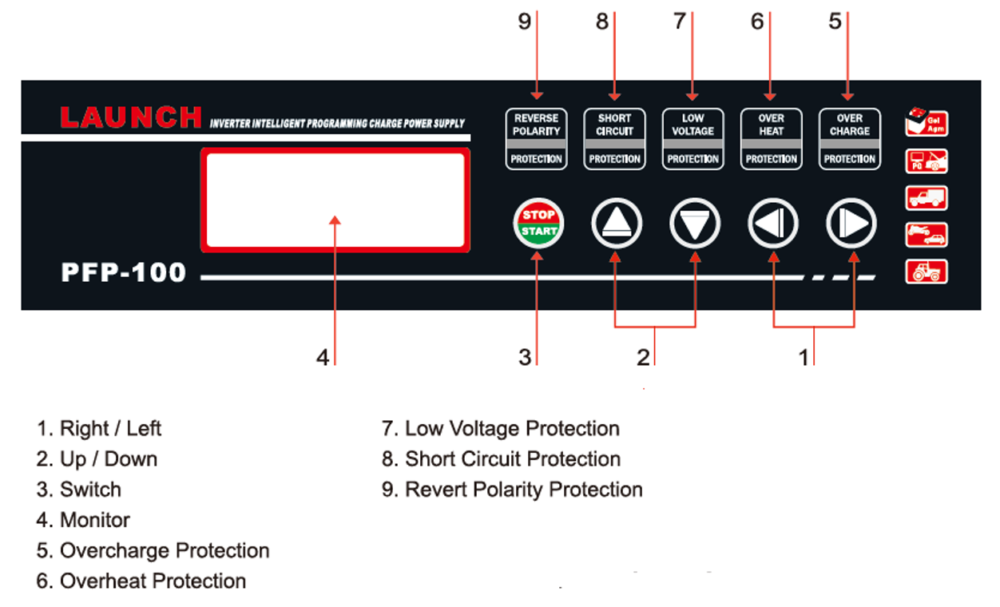 LAUNCH PFP100 Battery Charger 220V 5 protection can be applied: