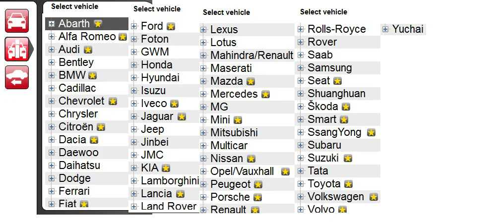 Supported car models: Alfa Ro.meo, Au.di, B M.W, Cadi.llac, Chevro.let, Chr.ysler, Citr.oen, Da.cia, Dae.woo, Dod.ge, Fer.rari, Fiat, Fo.rd, Hon.da, Hyun.dai, Is.uzu, Ive.co, Jagu.ar, Je-ep, Kia, Lambor.ghini, Lancia, La.nd Ro.ver, Le.xus, Lotus, Mahundra/Re.nault, Maserati, Maz.da, Merc.ed-es, M.G, Mini, Mitsu.bishi, Ni.ssa.n, Op.el/Vauxhall, Peug.eot, Por-sch.e, Ren.ault, Rolls-royce, Rov.er, Sa.ab, Sams.ung, Seat, Sko.da, Sm-a.rt, Ss.ang Yong, Sub-aru, Suz.uki, Toy.ota. V-W etc…