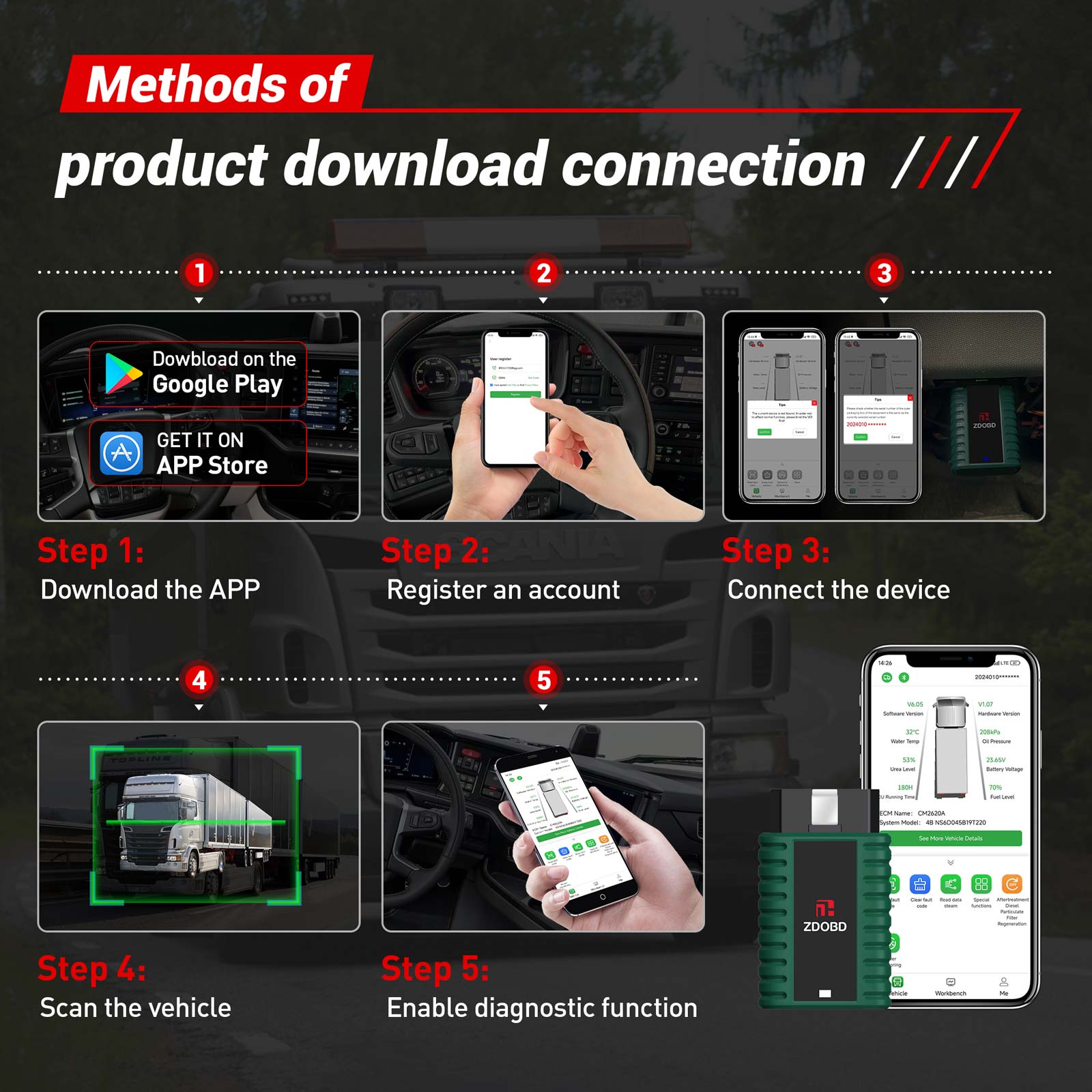 The ZDOBD EPS001 Bluetooth Heavy Duty Truck Scanner connects via Bluetooth in just few seconds. No more tangled cables—just download the app, register, and you’re good to go!