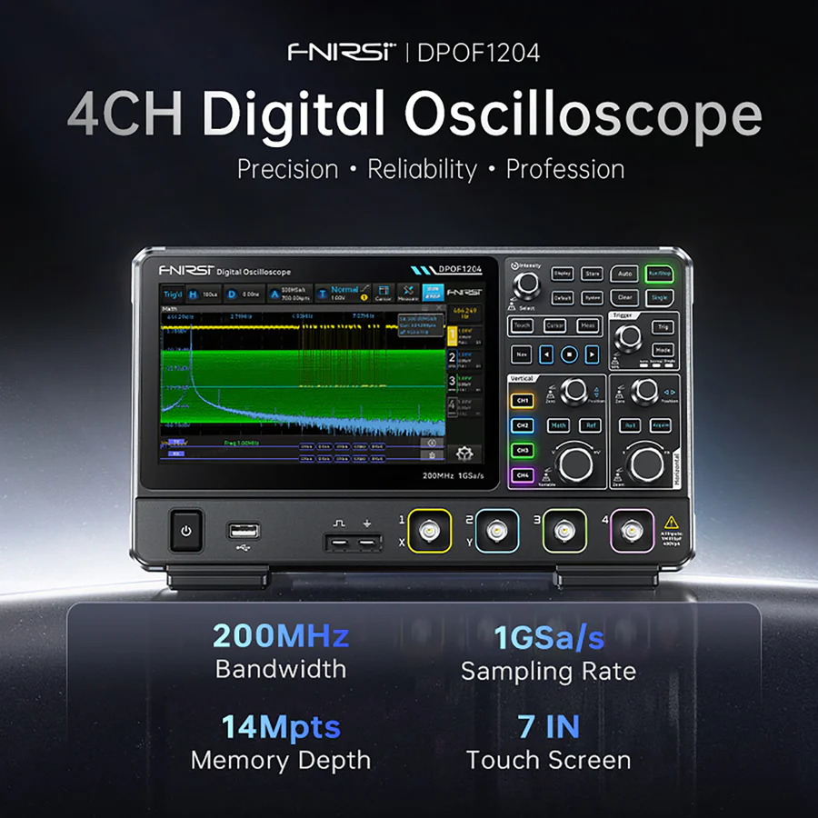 Fnirsi DPOF1204 DPO Digital Phosphor Oscilloscope is 4-Channel High-Refresh-Rate Desktop Digital Fluorescence Oscilloscope. Fnirsi DPOF1204 200mhz 4 channel automotive oscilloscope 4CH 200MHz 1GSa/s built-in FFT function Support Waveform function. ChiShiTech.com Fnirsi DPOF1204 Bench Fluorescent oscilloscope Fnirsi DPOF1204 desktop oscilloscope waveform generator Analog 4CH Ultra Precision.