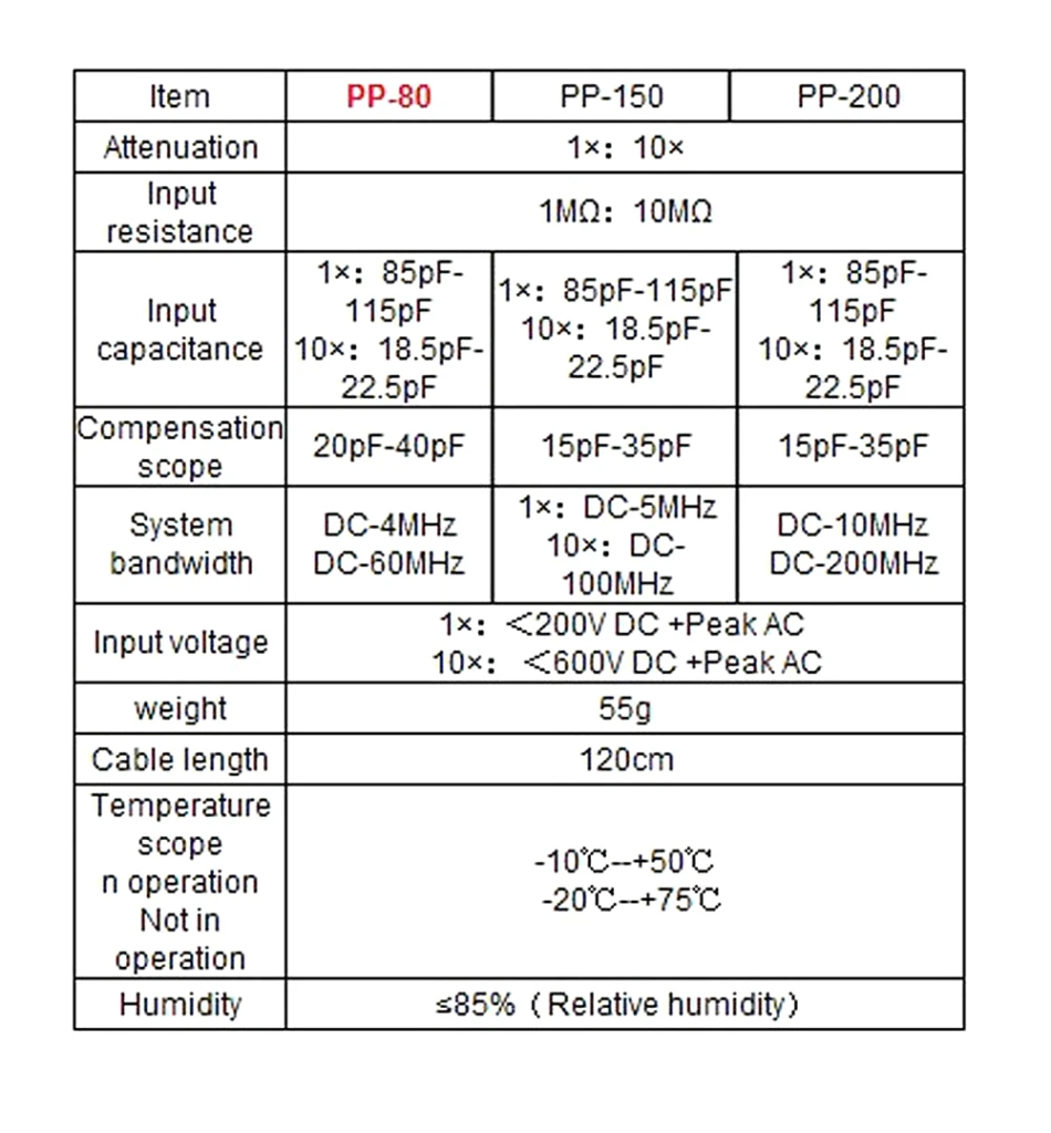 Hantek PP-80/150/200 Oscilloscope Probe Kit Specifications: