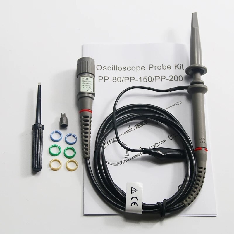 Hantek PP-80/150/200 Oscilloscope Probe Kit Compatible with domestic and international digital and analog oscilloscopes in relevant frequency. PP-80/150/200 Hantek Digital Oscilloscope Probe Accessories for 60MHz 100MHZ 200MHZ 250MHZ Oscilloscope Attenuation ratio: 1× and 10× optional. CheShiTech.com Hantek Oscilloscope Probe Kit Hantek PP-80 PP-150 PP-200 suitable for use with all Hantek and third-party digital and analogue oscilloscopes as it is fitted with a standard BNC connector.